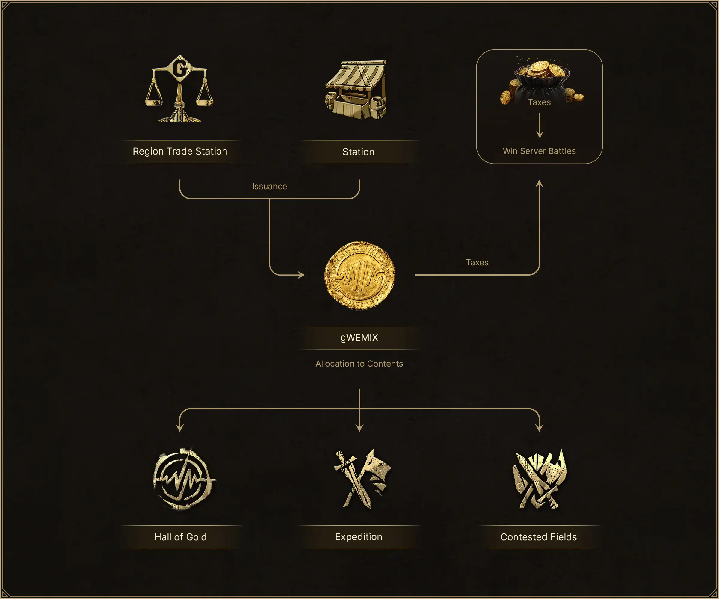 In the first month after the game's launch, gWEMIX will only be supplied from the pre-set WEMIX Reserve. From the second month on, the gWEMIX drop of each server will be issued using the fees generated from the Station and Region Trade Station.